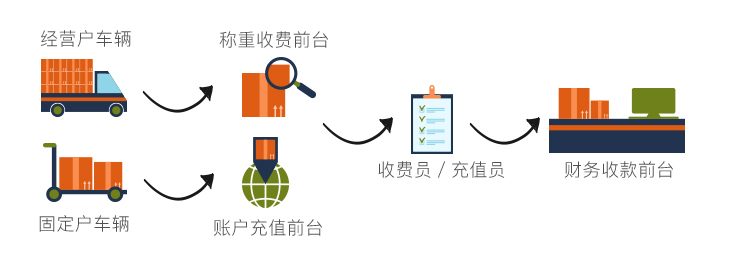 系統(tǒng)的三個(gè)前臺(tái)設(shè)計(jì):稱重收費(fèi)前臺(tái),賬戶充值前臺(tái)和財(cái)務(wù)收款前臺(tái);三個(gè)前臺(tái)的設(shè)計(jì),完美解決了市場交易費(fèi)的資金流向管理,做到了“人”“錢”“帳”一致,筆筆可查,可追溯。