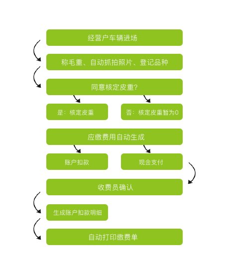 入場收費(fèi)包括稱重和結(jié)算兩個(gè)環(huán)節(jié);進(jìn)場核定皮重為0時(shí),出場時(shí)允許稱重退費(fèi)。固定經(jīng)營戶自動(dòng)從賬戶扣款,余額不足時(shí)可以現(xiàn)金補(bǔ)齊費(fèi)用,臨時(shí)經(jīng)營戶現(xiàn)金繳費(fèi)。收費(fèi)員收齊費(fèi)用后,確認(rèn)已收費(fèi),系統(tǒng)數(shù)據(jù)提交保存,自動(dòng)打印入場繳費(fèi)憑證,車輛憑單入場。